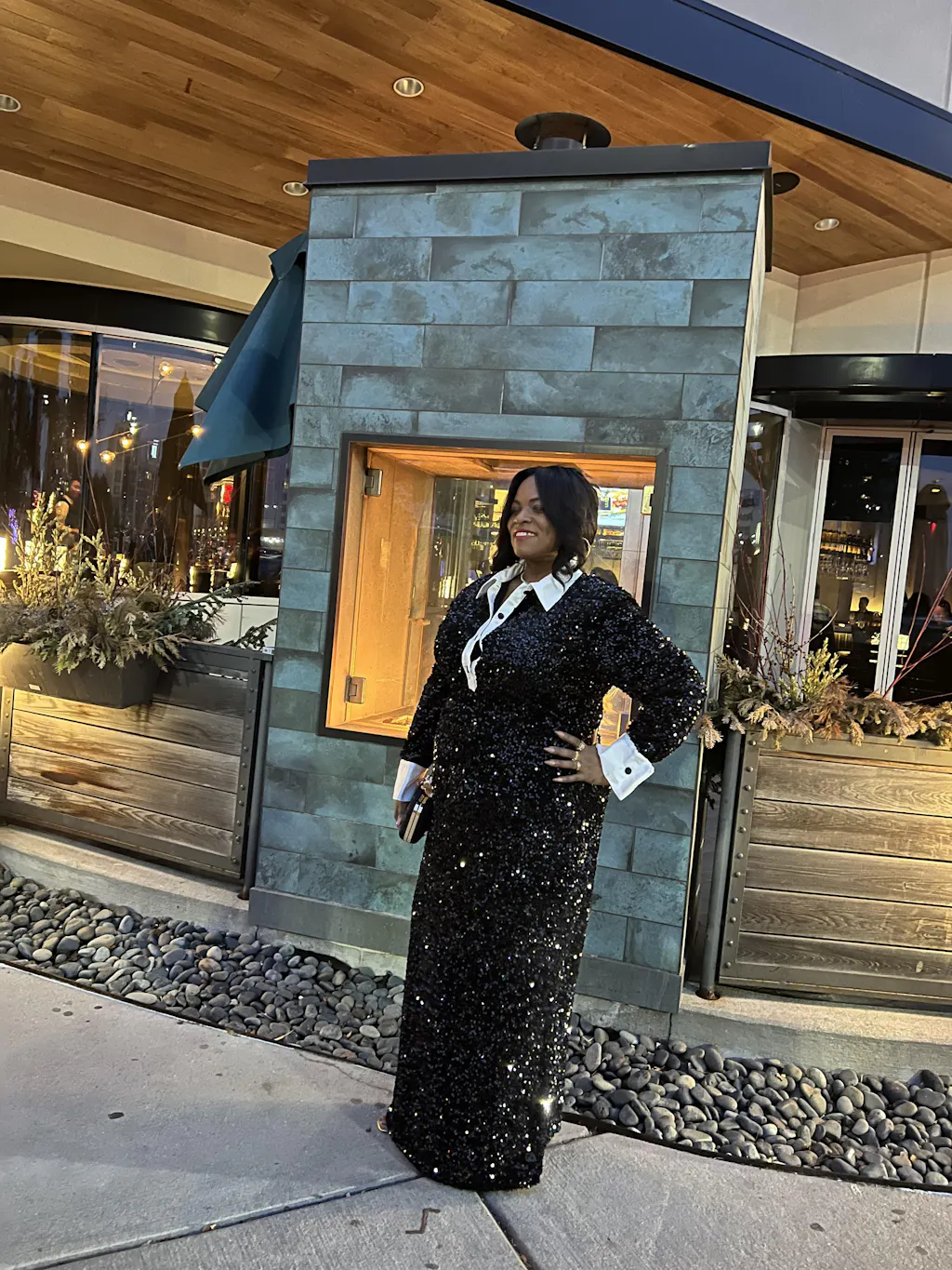 Introducing our alluring REI Sequin Dress in Onyx — a fusion of timeless charm and modern sophistication that promises to elevate your evening ensemble. An elegant white cuff and collar create a striking contrast, while black contrasting snaps along the front infuse a contemporary flair into the classic silhouette.